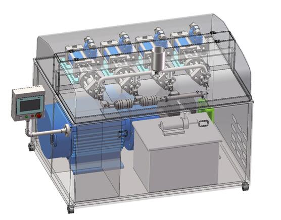 Intensifier type: The intensifier-type homogenizer is the result of the development of ultra-high pressure technology in recent years. One of its mechanisms involves the motor driving the oil pump to pressurize the material through the hydraulic system. The pressure provided by the hydraulic system is higher than in direct-drive homogenizers, while the volume and the minimum material requirement is smaller. The intensifier-type homogenizer can be applied to both laboratory and production homogenizers with high pressure. Hydraulic homogenizers are expensive, but the hydraulic intensifier can achieve low-frequency and high-thrust piston movement, which increases the machine’s service life and reduces its maintenance costs. Using parallel four-cylinder technology, stable pressure can be obtained without an accumulator, achieving ultra-high pressure of up to 45,000 psi.